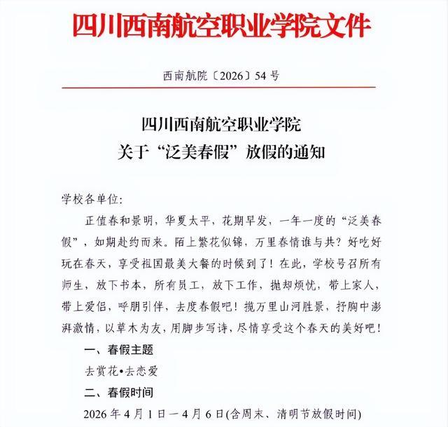 四川西南航空职业学院关于“泛美春假”放假的通知:春假时间为2026年4月1日至4月6日(含周末、清明节放假时间)。