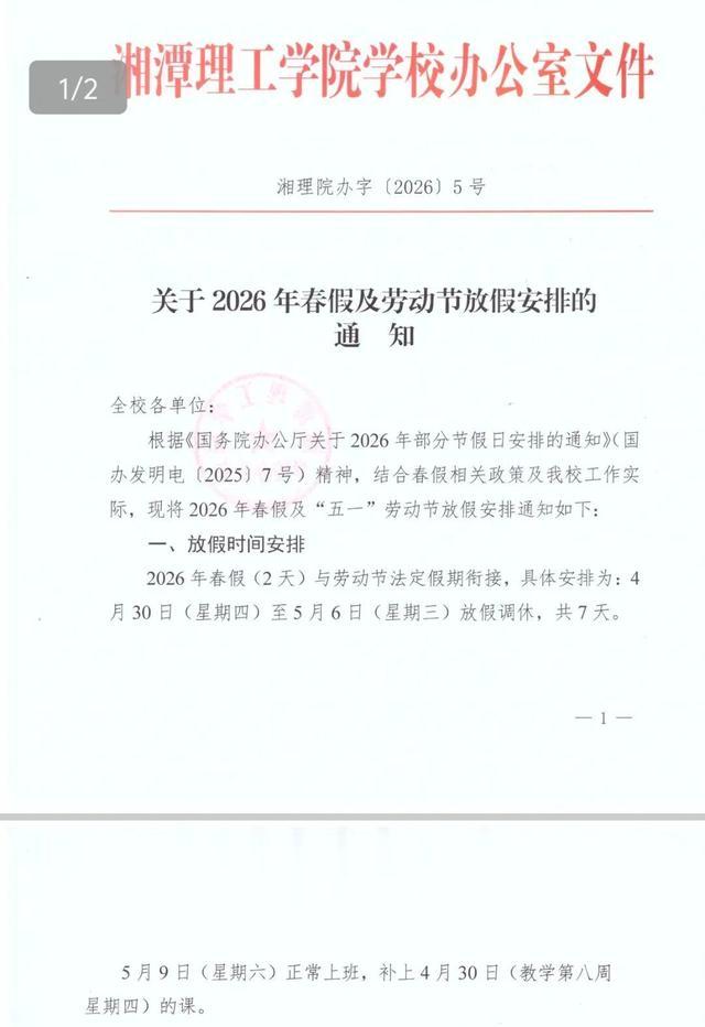 4月17日,湘潭理工学院发布《关于2026年春假及劳动节放假安排的通知》,表示学校将于4月30日至5月6日 放春假,与劳动节法定假期衔接,连休7天。