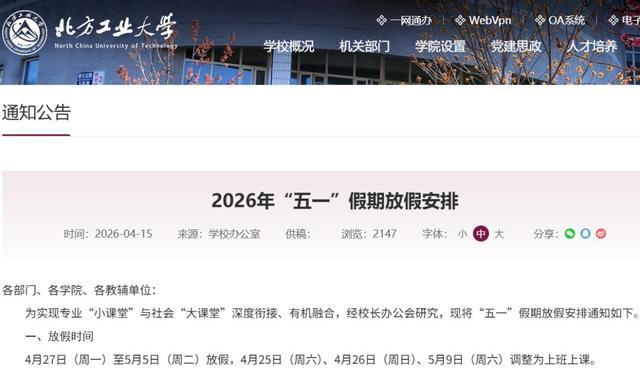 北京联合大学关于2026年清明节放假和春假安排的通知:春假放假时间为4月7日(星期二)至4月12日(星期日)。