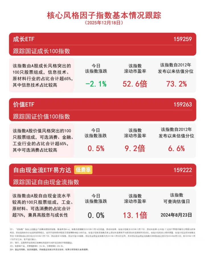 市场今日震荡分化,科技方向集体承压国内前十股票配资平台,高股息板块走强。截至收盘,国证价值100指数上涨0.5%,国证自由现金流指数接近平收,国证成长100指数下跌2.1%。资金逆势布局,成长ETF(159259)全天净申购近3000万份。